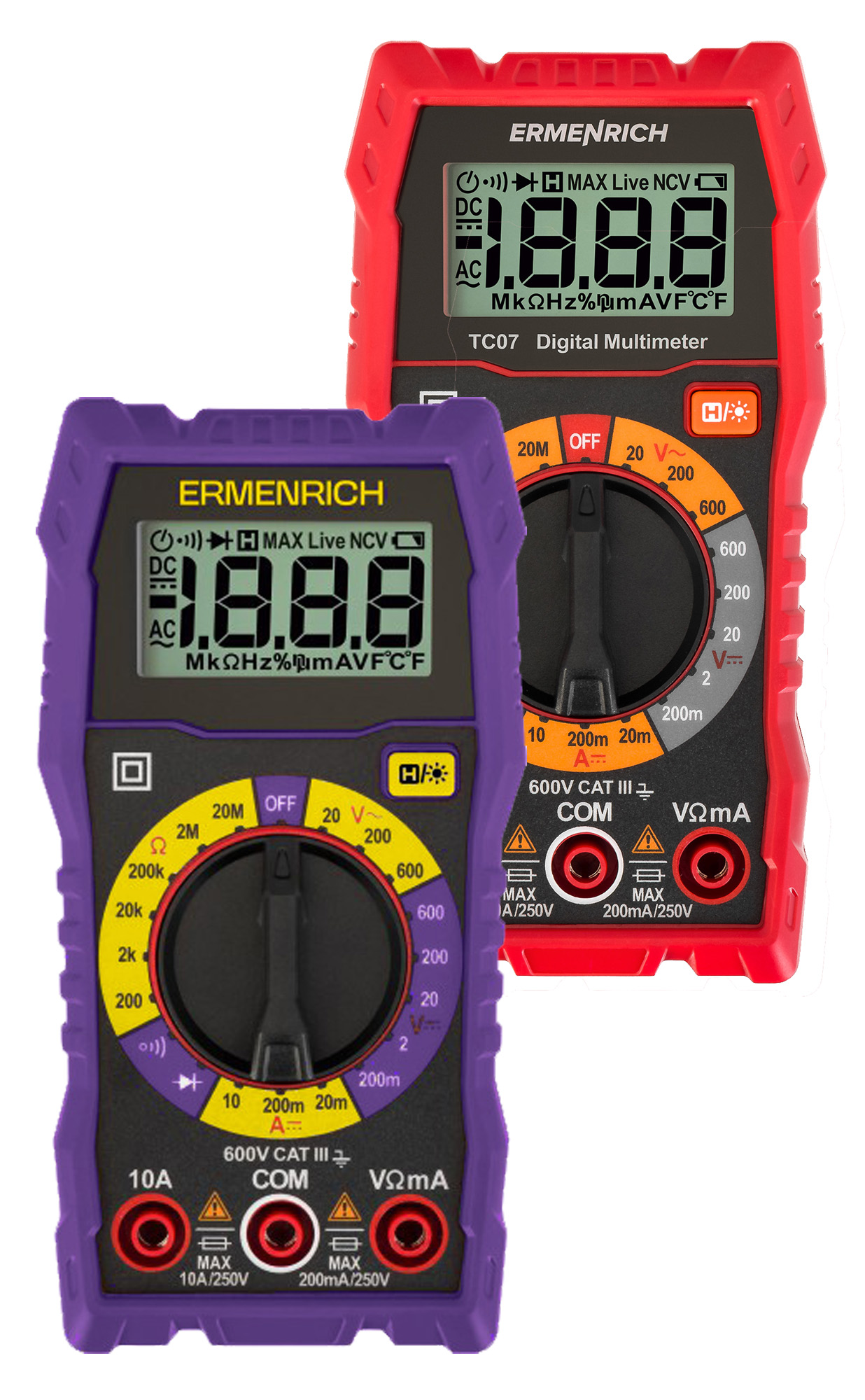 A klasszikus forgókapcsolóval ellátott Ermenrich Zing TC07 digitális multiméter egyen- és váltóáramú (DC és AC) feszültség, egyenáramú (DC) áramerősség és ellenállás mérésére szolgál. Funkciói elegendőek a legtöbb otthoni feladat elvégzéséhez, valamint a professzionális villanyszerelők munkája során jellemző, alapvető mérésekhez.