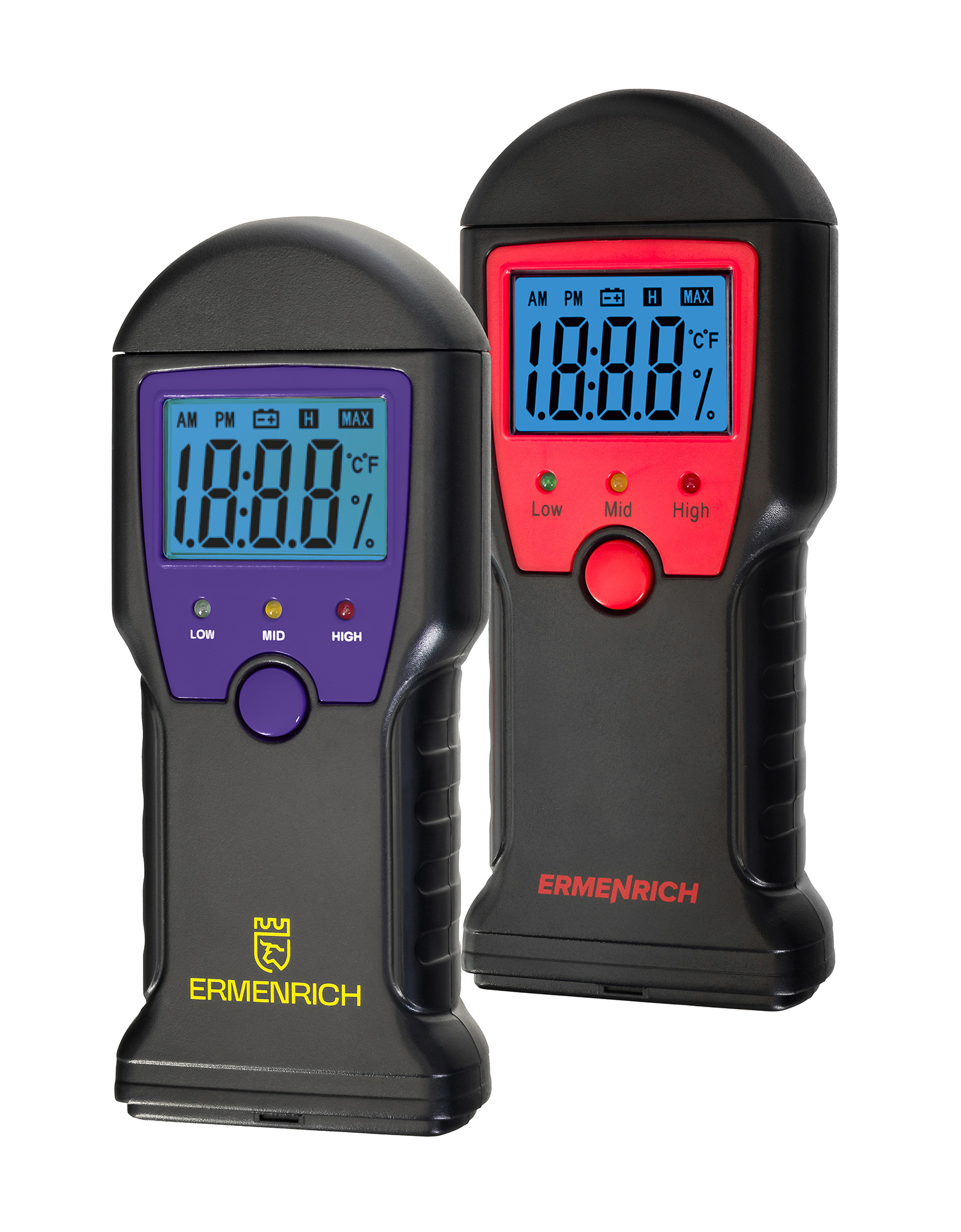 Az Ermenrich Wett MW10 egy tűs nedvességérzékelő, melynek segítségével meghatározható a fa, építőipari keverékek és habarcs nedvességtartalma. Az eszköz Celsius vagy Fahrenheit fokban is képes mérni a hőmérsékletet. Egyszerűen, egyetlen gombbal vezérelhető. A mért értékek nagy számjegyekkel és élénk kék háttérvilágítással jelennek meg a beépített képernyőn. A képernyő alatt három LED-jelzőfény található, amelyek átfogó értékelést adnak arról, hogy mennyi nedvesség van az anyagban: a zöld alacsony, a sárga fokozott, a piros pedig magas nedvességtartalmat jelent.
